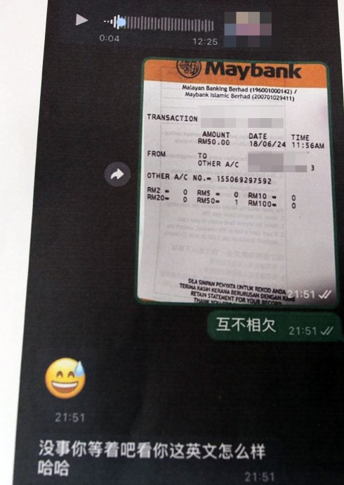 “而且必须在早上10时前转账付款,否则需额外支付1000令吉,也就是3500令吉。对方还扬言道,倘若我不缴付费用,那就会受到对付,包括上门骚扰我和家人。”