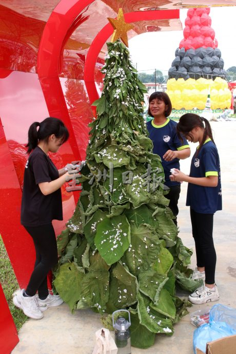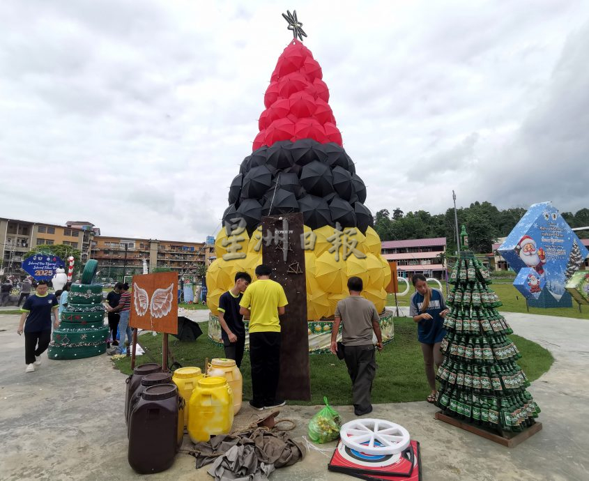 除了高达33呎高的雨伞圣诞树、灯饰等已完成布置,广场也迎来了创意环保圣诞树制作比赛的参赛者,带着各种可循环使用的材料如旧轮胎、酒瓶、塑料水桶及树叶等制作圣诞树。