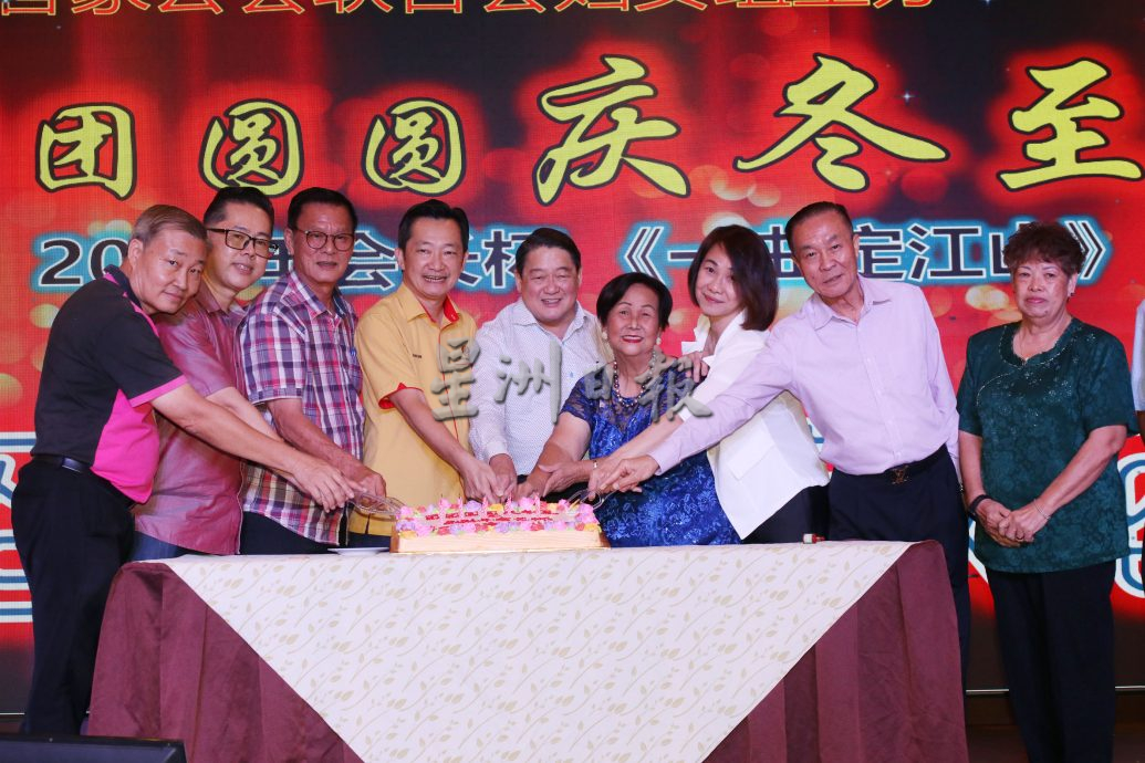 众理事和嘉宾主持切蛋糕仪式庆冬至。左起为财政孔令龙、青年团团长叶玟豪、森华堂主席黄俊棠、谢琪清、黄新发、叶丽明、丘瑞玲、黄国强和刘美妘。