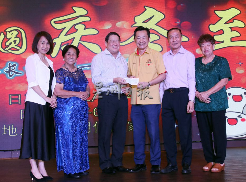 谢琪清(右三)移交拨款给黄新发(左三)。左起为筹委会主席丘瑞玲、叶丽明,右起为妇女组署理主席刘美妘和森客联会署理主席黄国强。