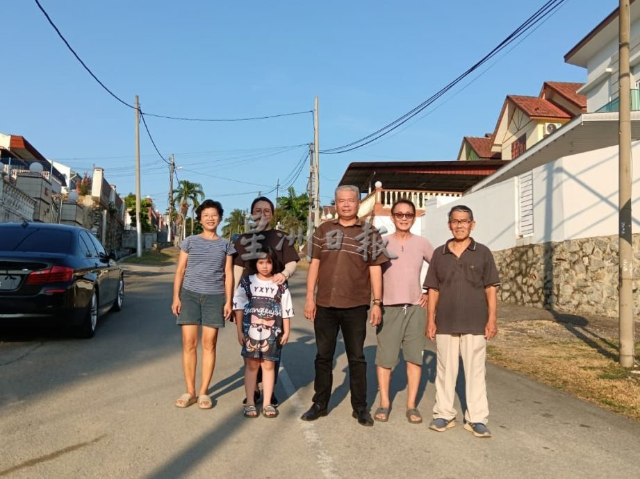 许金水(中)接获投诉后,前往淡边斯里柏迈花园了解实况。右起李坚城、郑咏汶。右起彭佑洲家属及刘慧琴。(李坚城提供)