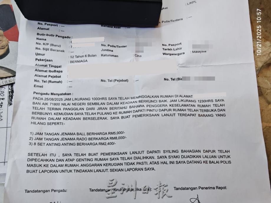 “我赶回家后,发现厨房后门被撬开,屋内一片凌乱,柜子全被翻动,贵重首饰等物品被洗劫一空,估计损失逾1万5000令吉,还不包括维修被小偷撬开破坏的部分。”