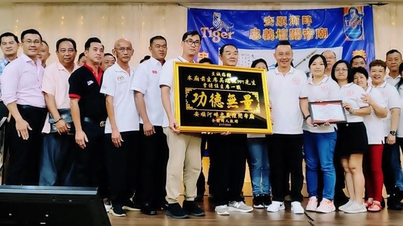 担任安顺河畔忠义坛关帝庙主席28年的吴瑞桃,卸下主席职位,让新任主席庄国财接手掌舵。
