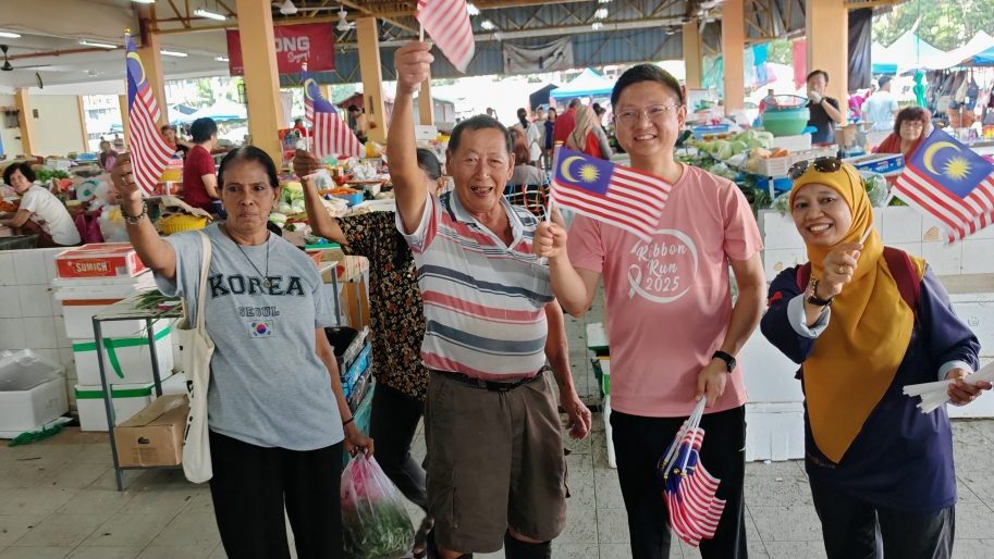 郑瑞隆到市镇分派国旗 商家反提醒:不要放倒转