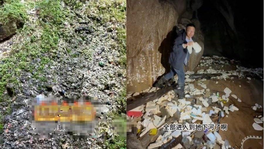 中国贵州天然钟乳石洞惊现“10层楼高垃圾” 污水直排臭味满坑