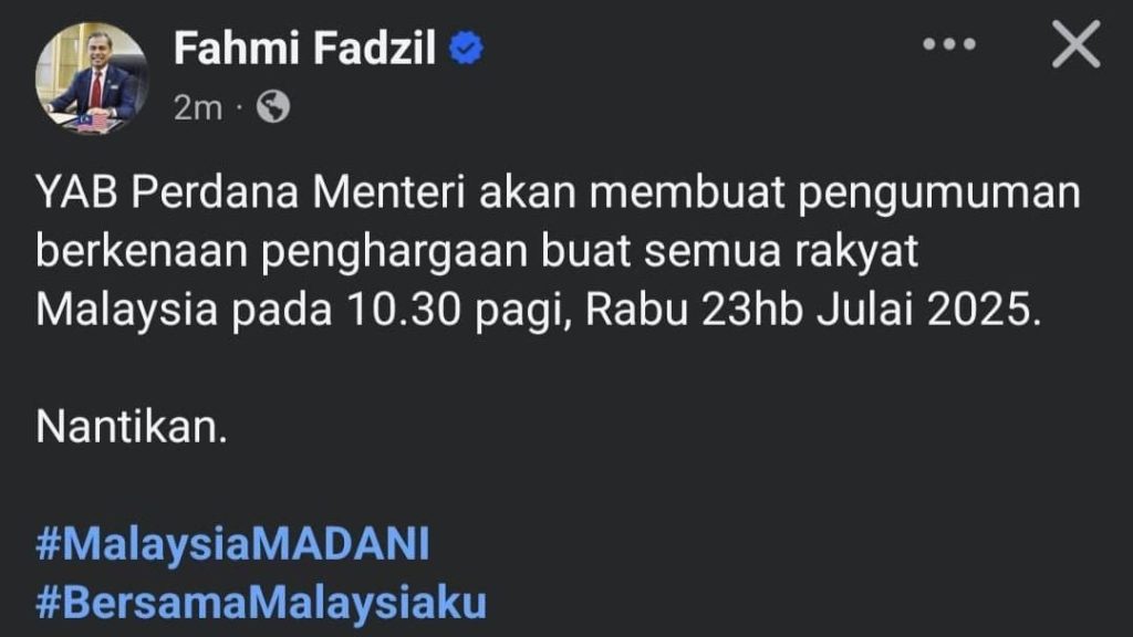 首相拿督斯里安华今早通过直播宣布多项最新惠民政策,包括每名18岁及以上公民获得100令吉购物券、RON95汽油价格下调、10条大道维持现有过路费、9月15日列为额外公共假期等,以减轻人民生活负担、促进国内经济。