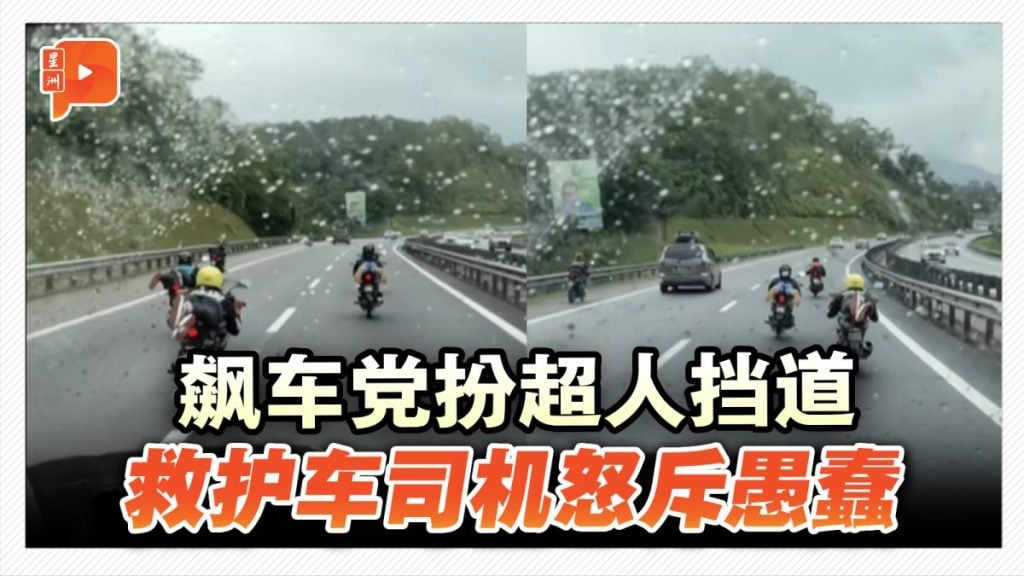 “我们狂按喇叭他们也装没听见,真是离谱。”一群摩托骑士在大道模仿“超人”姿势飙车,挡住救护车去路,还无视警笛,让司机气炸。 救护车司机沙其林在社媒上传视频,指当时正赶往一宗车祸现场救援,却被飙车党堵在前头。