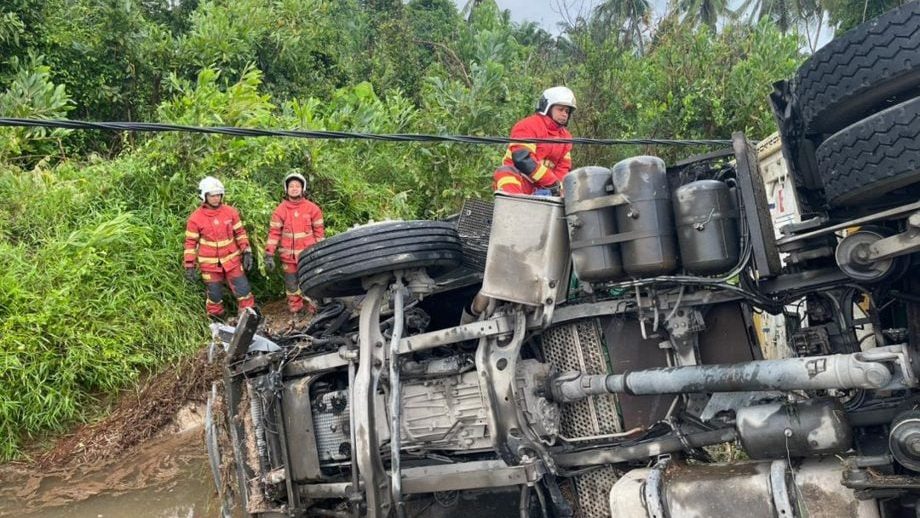 共乘一辆摩托车的一家四口,因停车救助翻车受困的受害者,结果不幸遭一辆刚好驶抵该路段的罗里撞及,造成一家四口中的母亲身亡,父亲及两名孩子受伤。