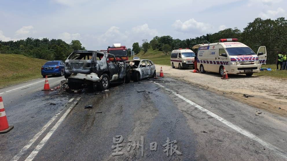 柔佛士乃迪沙鲁大道发生连环撞事故,其中两辆轿车起火燃烧,酿成2死、3伤的惨剧。